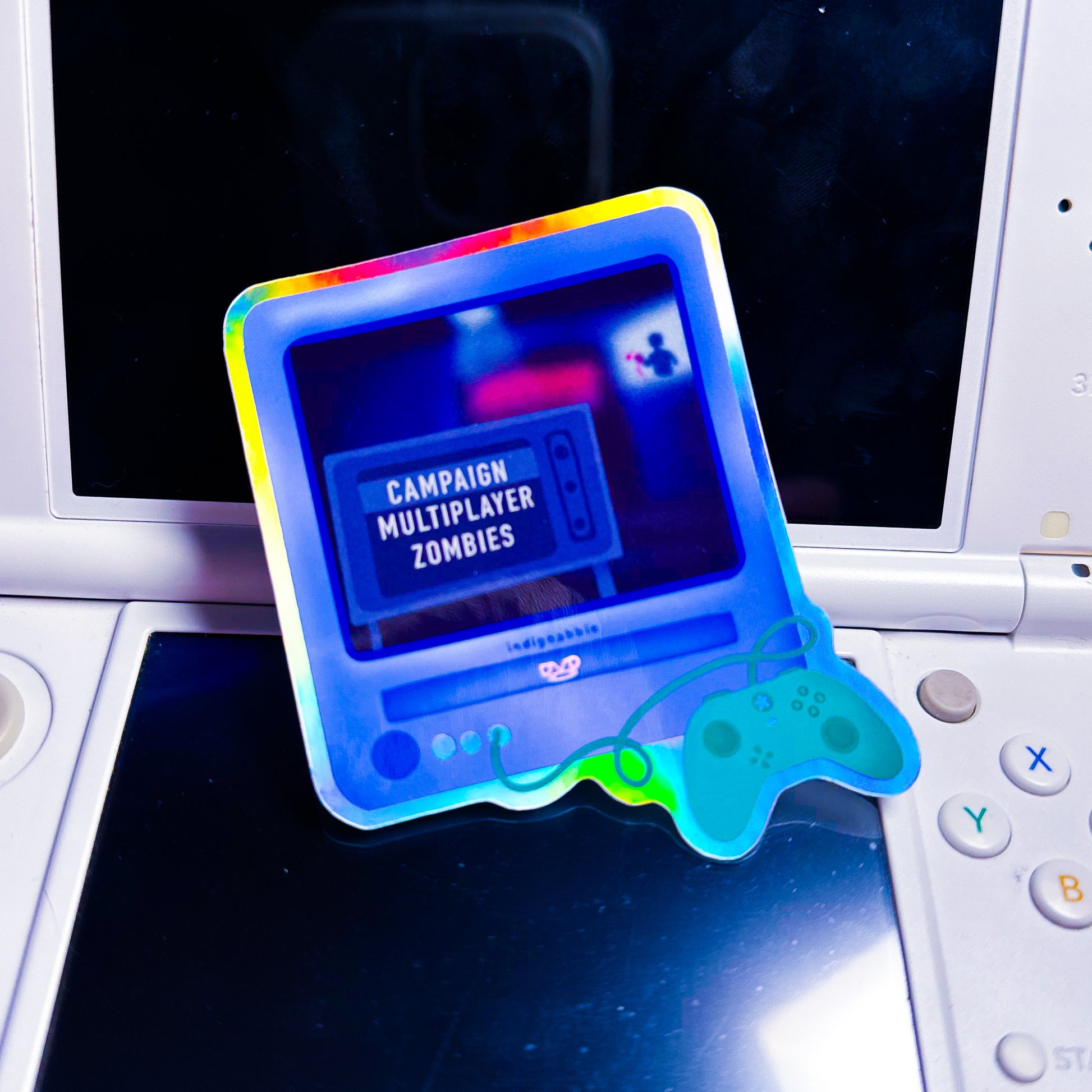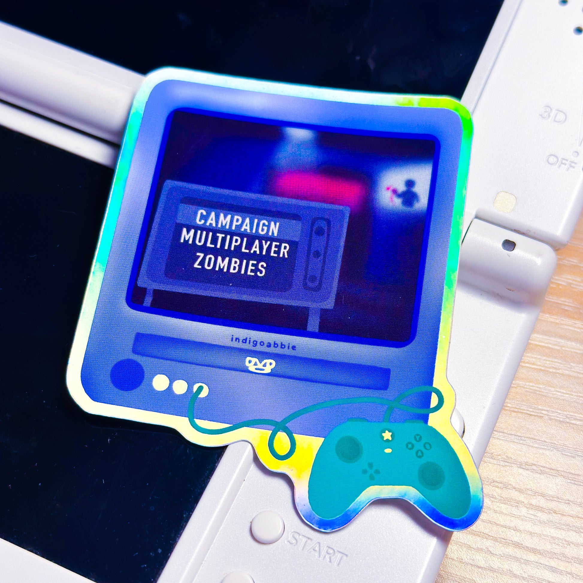 this holographic sticker features Call of Duty Black Ops One. fully waterproof, durable, and 3 inches on the longest side, it’s a nostalgic little pop of colour for your switch, water bottle, or laptop. it’s giving ict class :)