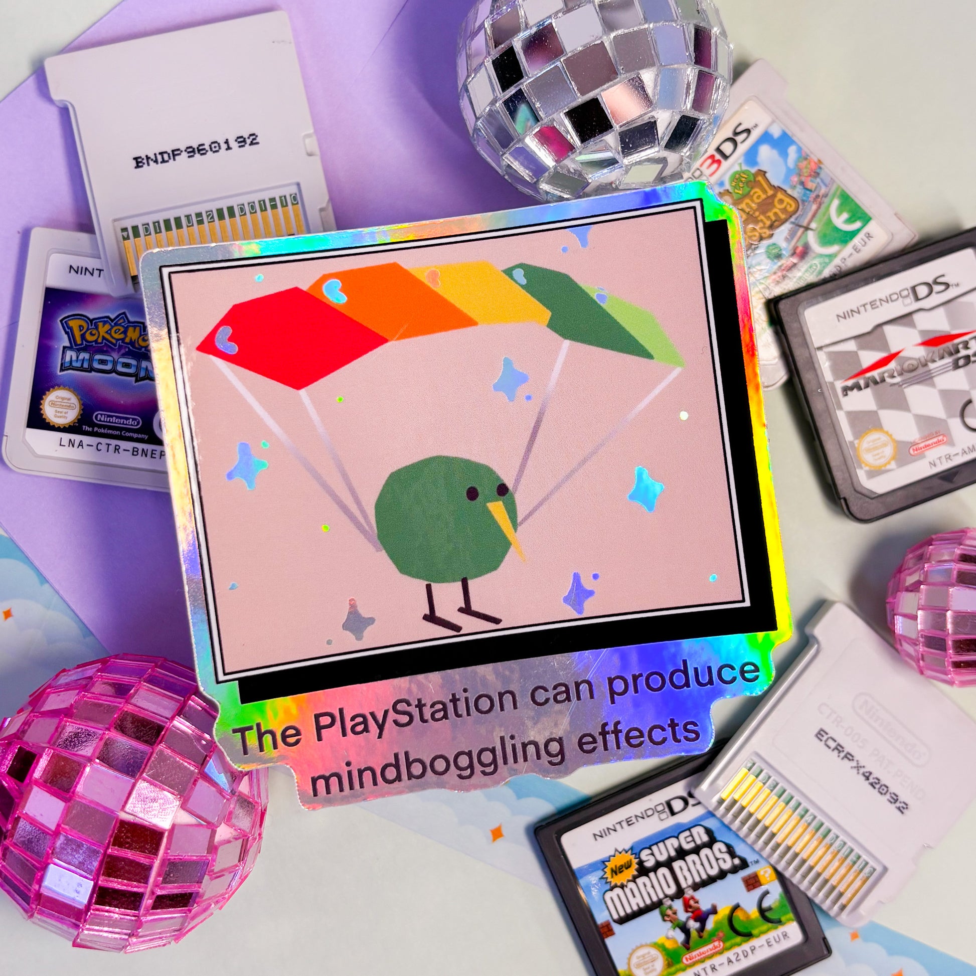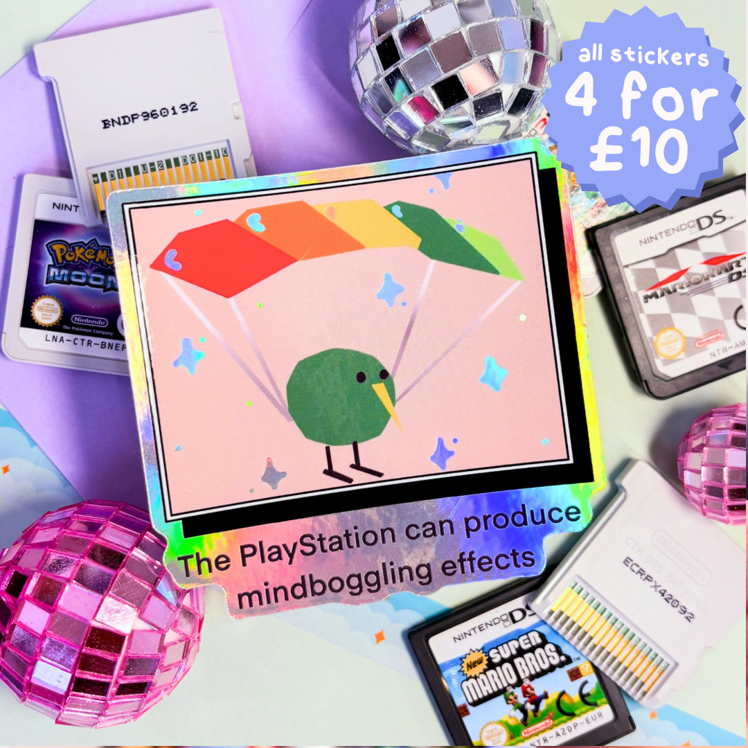 this holographic sticker features the low poly bird from “the playstation can produce mind boggling effects” meme. fully waterproof, durable, and 3 inches on the longest side, this sticker adds a touch of retro gaming humour to your switch, water bottle, or laptop. it’s the perfect throwback for anyone who grew up with the ps2 or appreciates nostalgic gaming memes.