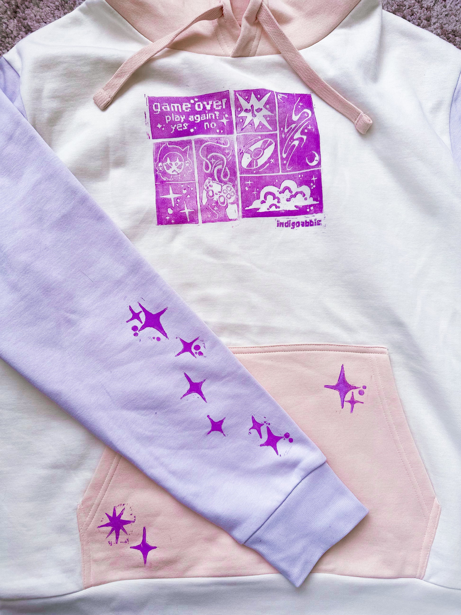 Pastel Colourblock Hoodie with the Game Over design in Indigo - hand pressed by abbie at home!